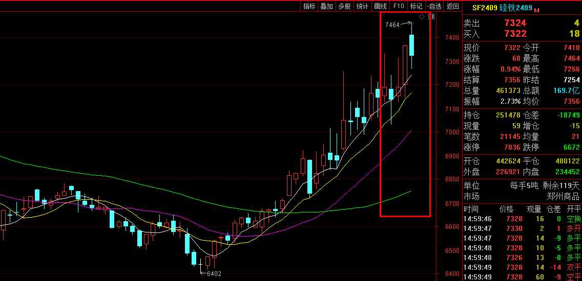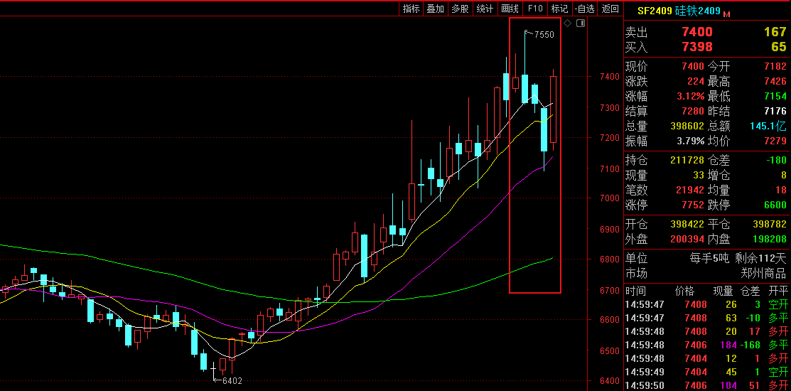|  | 5月30日上午,硅铁期货主力合约应声涨停,最高价7824元/吨,涨幅8.01%;31日盘面收盘8108元/吨,涨幅5.27%;厂家多暂停报价。 |