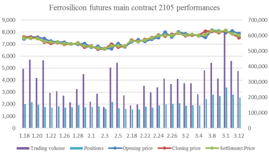[Ferrosilicon Futures 2105 Contract] Opening price of ferrosilicon futures 2105 contract of this week was 8,166, highest price was 8,386, lowest price was 7,542, closing price was 7,552 and the settlement price was 7,718. The trading volumes were 2,183,168 and the positions were 199,164.