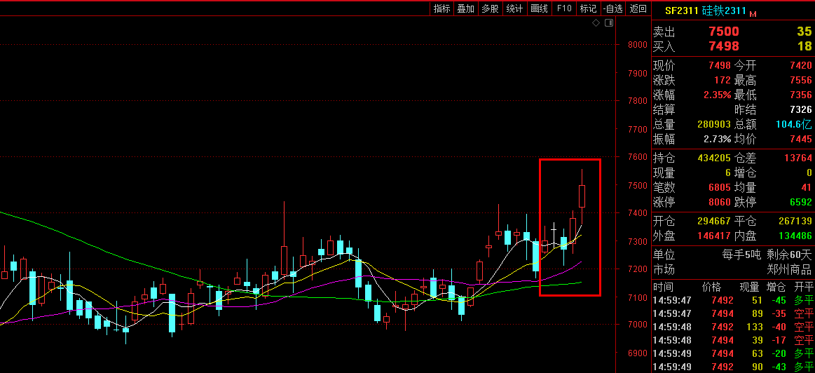 [Futures Market] The weekly opening price of the 2311 main contract was 7258, with a maximum price of 7556, a minimum price of 7210, a closing price of 7498, a settlement price of 7446, a trading volume of 1110735, and a position of 434205, an increase of 4.28%.