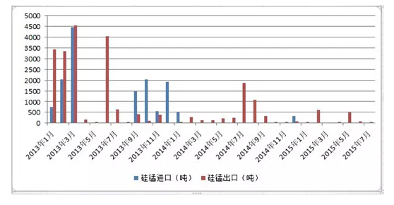 三、进出口:由上图(图六)可见,硅锰进出口方面则依旧清淡,国内的出口关税20%、最低出口限额、出口许可证等一系列政策,以及国家不鼓励高污染高耗能产品出口导致国内硅锰进出口市场冷清依旧。而澳洲、南非等锰矿资源国,自产自销,抢占不少国际需求,所以2015年全年国内硅锰仍呈现出不去,也进不来的局面。