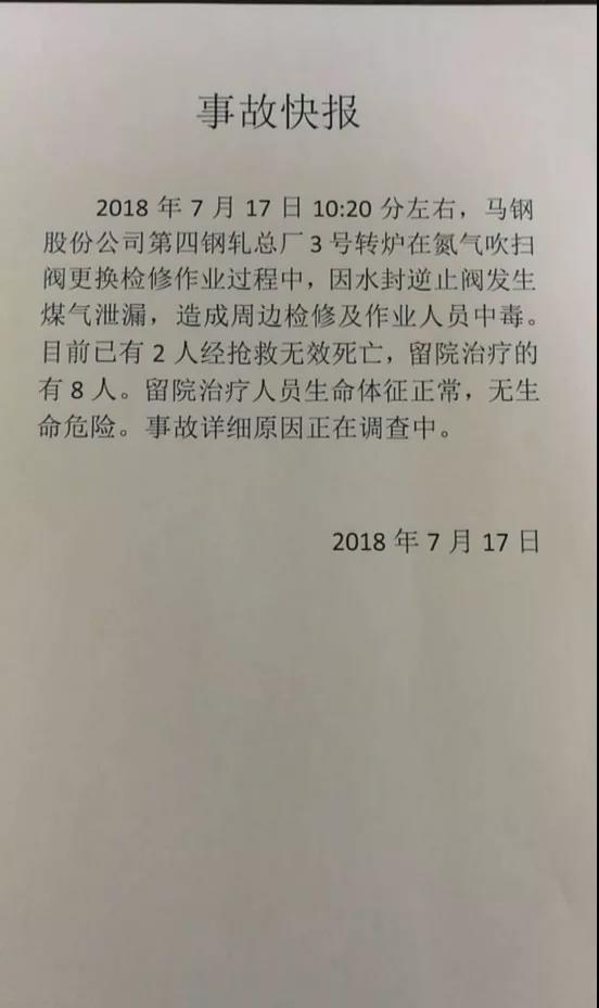 【中国铁合金网讯】17日下午,马钢集团发布公告称,2018年7月17日10时20分左右,马钢股份公司第四钢轧总厂3号转炉在氮气吹扫阀更换检修作业过程中,因水封逆止阀发生煤气泄露,造成周边检修及作业人员中毒。目前已有2人经抢救无效死亡,留院治疗的有8人。留院治疗人员生命体征正常,无生命危险。事故详细原因正在调查中。