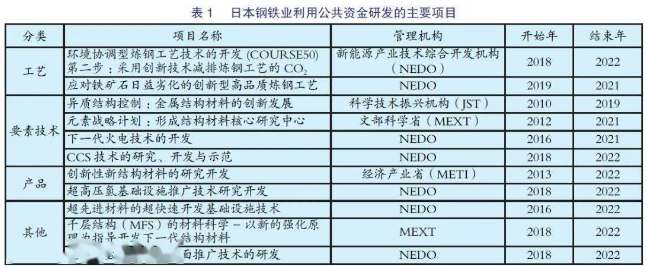 2019财年启动的新能源产业技术综合开发机构(NEDO)项目是“应对铁矿石日益劣化创新和集成的高品质炼钢工艺”。表1是日本钢铁业获得公共资金资助的、与钢铁有关的主要研究和技术开发项目,多数项目与工艺、环境、能源以及材料研发有关。