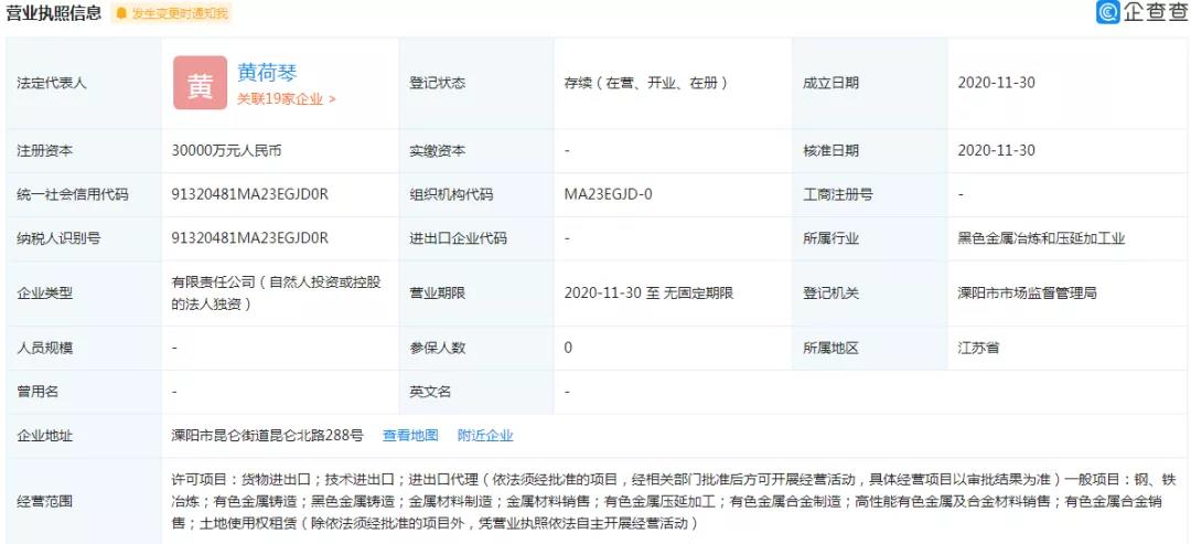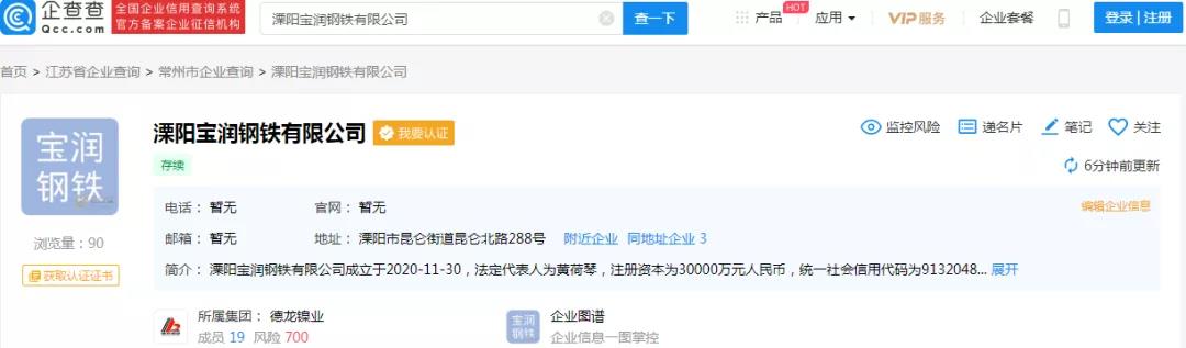2020年11月30日,溧阳宝润钢铁有限公司注册成立,江苏德龙镍业有限公司100%控股。