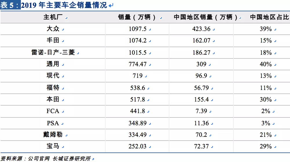 汽车销售市场仍以外海市场为主:2019年大众、丰田、雷诺-日产-三菱的销量均超过一千万辆,但中国地区销量仅大众达到39%,其余两家中国地区销量均不到20%。前十大车企中,仅通用汽车中国地区销售达到40%。整体来看,全球大型知名车企销售市场仍集中在欧美等发达国家。