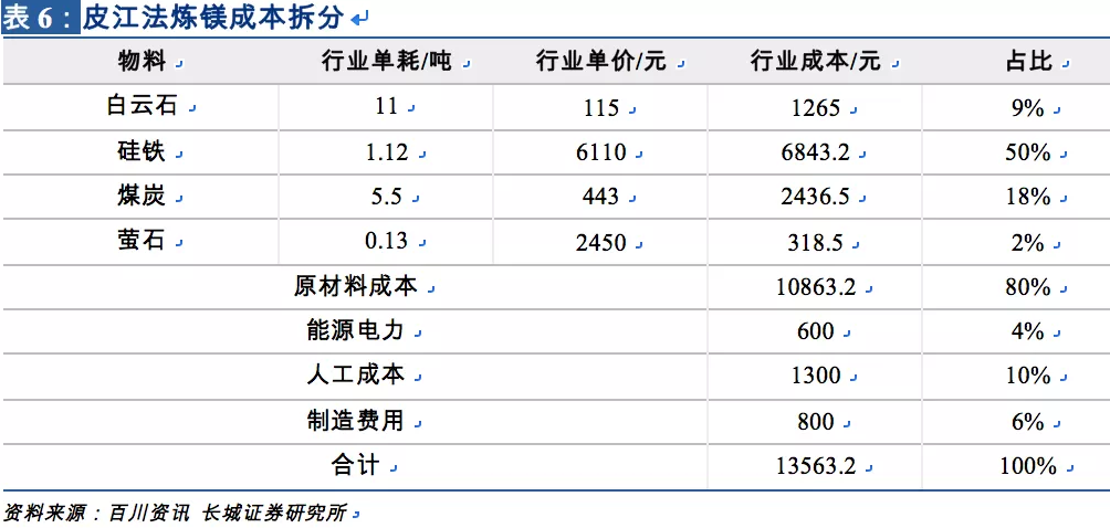 国内目前原镁冶炼以皮江法为主。皮江法成本中约80%为原材料成本,其中占比最大的是硅铁,占总成本约一半,其次为煤炭成本,约占总成本18%。