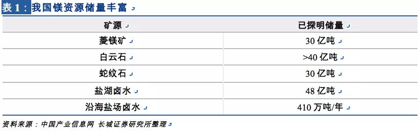 我国镁资源储量雄厚,已探明菱镁矿储量约30亿吨,白云石矿储量超40亿吨,西部盐湖卤水中直接含有大量氯化镁,如我国察尔汗盐湖卤水含量112.4g/L,储量达31亿吨。因此我国原镁及镁合金生产应用资源优势显著。