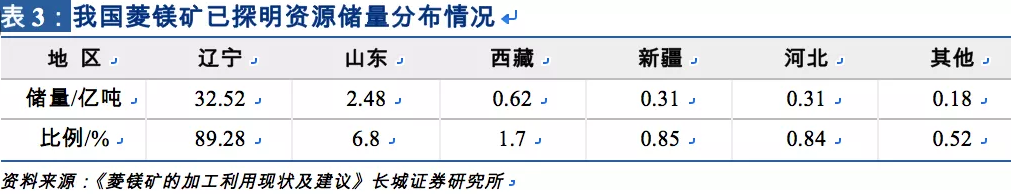 我国菱镁矿探明储量的矿区27处,分布于9个省(区),以辽宁菱镁矿储量最为丰富,主要集中于营口至大石桥至海城一带。其次是山东,此外,西藏、新疆、甘肃等地区菱镁矿也较丰富。而且我国菱镁矿的主要资源特点是储量相对集中,大型矿床较多;矿床类型较为单一,主要是积变质-热液交代型菱镁矿;特别是辽宁省的矿石品质优良,一般MgO的含量都在46%~47%。