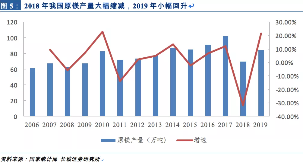 原镁冶炼能耗高,易产生大量废气废渣,2011年已被发改委列入限制类名单,新建产能审批通过概率低,近年来一直保持140-150万吨产能。尽管近年来国内镁冶炼技术工艺不断改进,但机械化、自动化水平仍然较弱,节能减排和回收利用水平亟需提高。我国原镁冶炼企业有80多家,产能分散且几乎为民营企业,资金链紧张,在去杠杆要求下存活率低,而一次性的环保投资更是众多企业无法逾越的鸿沟。在环保和去杠杆双重影响下,2018年我国镁行业供给缩减32%。2019年由于镁价回升,镁行业开工率提高,国内原镁产量同比增长21.48%。