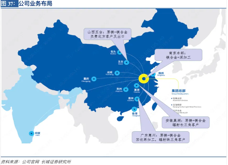 公司四大业务战线清晰,下辖20家全资及合资子公司分布在全国各地。由于山西、安徽地区白云石矿丰富,公司在山西五台、安徽巢湖建设原镁及镁合金生产基地,同时在惠州建立镁合金再生回收加工基地辐射珠三角地区。未来公司继续巩固上游龙头地位的同时,加大深加工产品研发与市场,致力提升多元化产品附加值,保证公司的持续发展与综合竞争力。