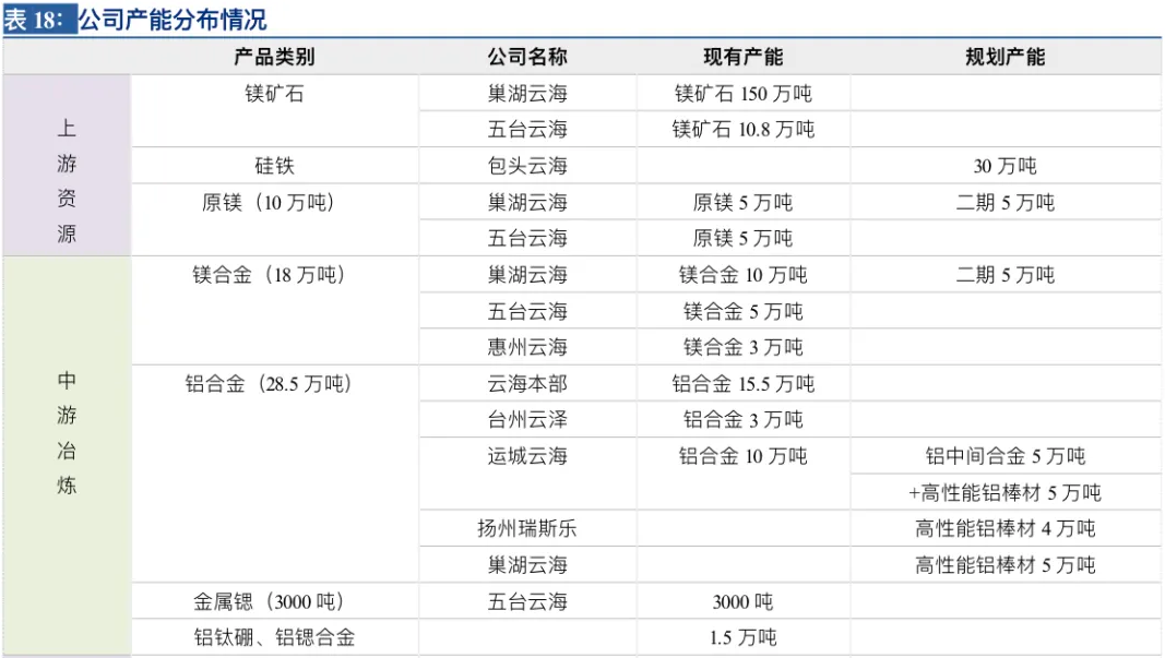 公司目前拥有原镁产能10万吨,镁合金产能18万吨;铝合金产能共计28.5万吨;压铸件1.8万吨,微通道扁管1万吨,中间合金1.5万吨,金属锶3000吨。其中,中间合金主要用于镁、铝合金生产过程的元素添加和晶粒细化,在云开公司生产。