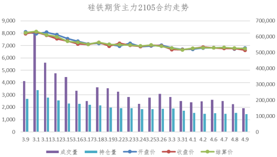 【期货行情】本周硅铁期货盘面下行盘整运行。2105主力合约开盘价6,812,最高价6,946,最低价6,628,收盘价6,630,结算价6,756,成交量722,416,持仓量112,314,涨幅-2.90%。