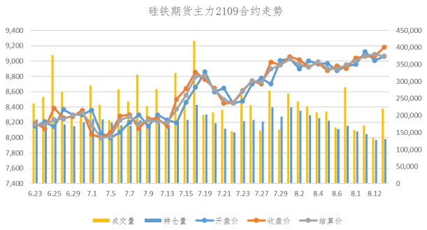 本周硅铁期货盘面高位上行,2109主力合约周开盘价8,934,最高价9,198,最低价8,830,收盘价9,180,结算价9,066,成交量967,917,持仓量130,984,涨幅3.17%。