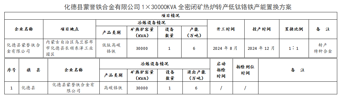关于化德县蒙誉铁合金有限公司1×30000KVA全密闭矿热炉转产低钛铬铁项目产能置换方案的公示