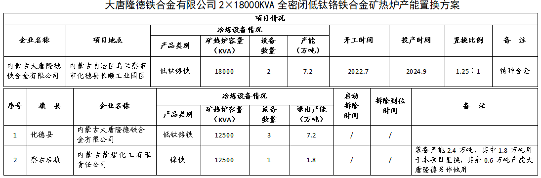 关于内蒙古大唐隆德铁合金有限公司2×18000KVA全密闭低钛铬铁铁合金矿热炉技改项目产能置换方案的公示