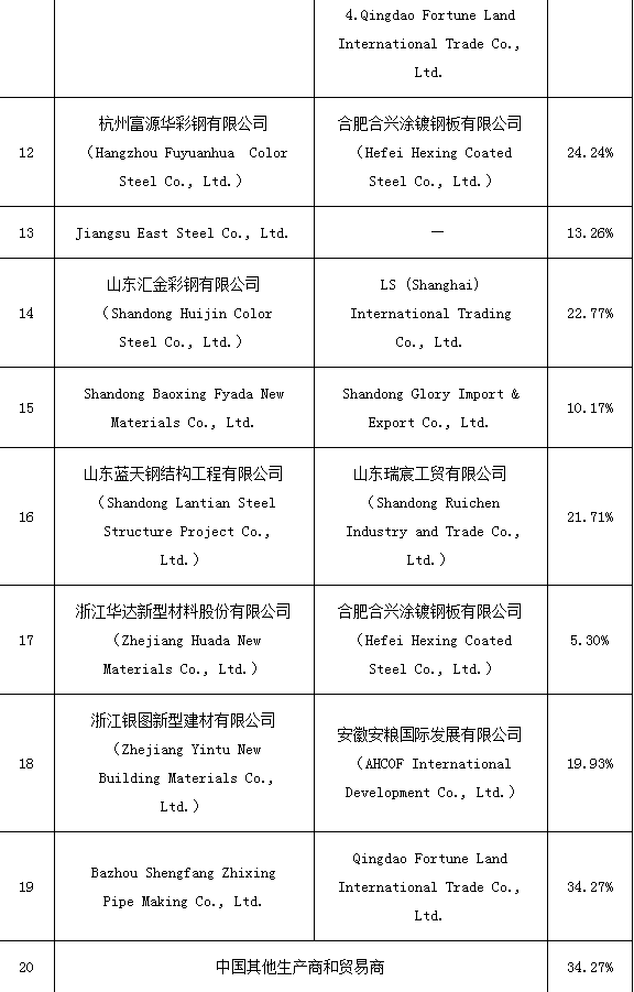 2021年4月20日,越南工贸部发布第1283/QD-BCT号决议,对原产于中国和韩国的彩涂钢板作出反倾销期中复审终裁,裁定中国涉案产品的反倾销税为2.56%~34.27%(详见附表),韩国涉案产品的反倾销税为4.95%~19.25%。 |