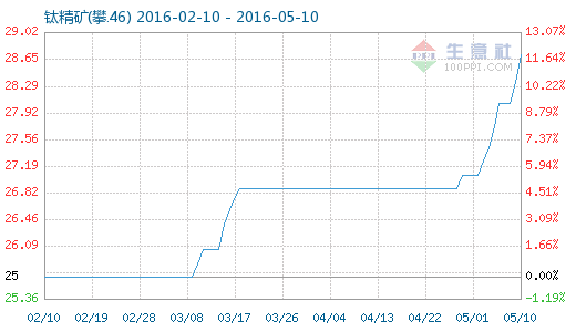 中国铁合金网讯:5月10日钛精矿(攀.46)商品指数为28.72,较昨日上升了0.37点,较周期内最高点100.00点(2012-10-30)下降了71.28%,较2015年04月16日最低点24.02点上涨了19.57%。(注:周期指2012-09-01至今) 数据监测钛精矿价格指数曲线如下: |