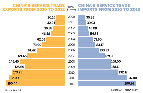 Meanwhile, trade in services was valued at about $540 billion, up 14.7 percent year on year, accounting for 11.5 percent of total foreign trade in 2013. The country's share of global services trade increased to 6 percent during the same period.