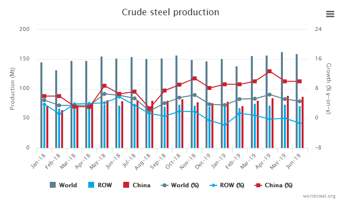 [Ferro-Alloys.com] World crude steel production for the 64 countries reporting to the World Steel Association (worldsteel) was 159.0 million tonnes (Mt) in June 2019, a 4.6% increase compared to June 2018.