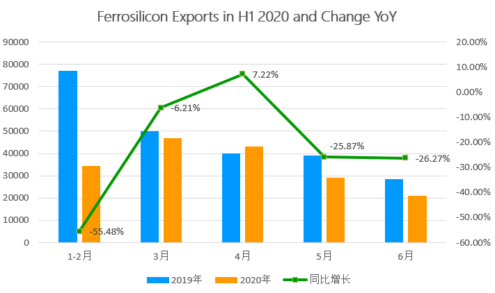 [Ferrosilicon Exports] The overall downturn of the export market continued. According to the statistics of the China Customs, in June 2020, China's export of ferrosilicon (> 55%) was 19694.647 tons, a month on month decrease of 29.11%, and a year-on-year decrease of 24.95%. In June, the export of ferrosilicon (≤ 55%) was 1312.8 tons, with a month on month increase of 9.08% and a year-on-year decrease of 41.67%. From January to June, China exported 164391.806 tons of ferrosilicon (> 55%), a year-on-year decrease of 24.66% and the export of ferrosilicon (silicon content ≤ 55%) was 9916.575 tons, with a year-on-year decrease of 41.11%.