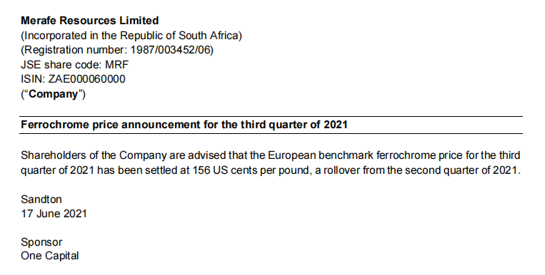 [Ferro-Alloys.com] Merafe Resources Limited released Ferrochrome price announcement on June, 17 for the third quarter of 2021 with 156 US cents per pound.