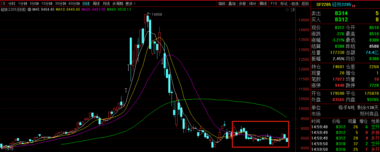 [Futures Market] The opening price of 2205 main contract of ferrosilicon futures in December was 8,604, the highest price was 9,198, the lowest price was 8,132, the closing price was 8,312, the settlement price was 8,388, the trading volume was 2,519,993, and the position was 74,601, a decrease of 3.80%.