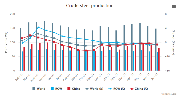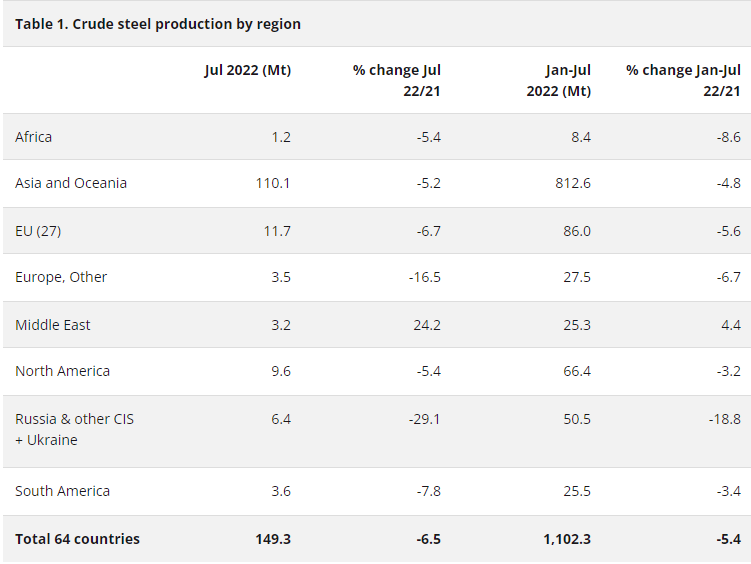 【Ferro-alloys.com】:World crude steel production for the 64 countries reporting to the World Steel Association (worldsteel) was 149.3 million tonnes (Mt) in July 2022, a 6.5% decrease compared to July 2021.