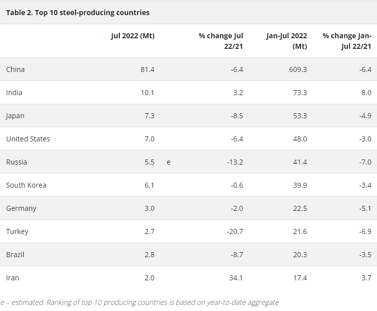 World crude steel production for the 64 countries reporting to the World Steel Association (worldsteel) was 149.3 million tonnes (Mt) in July 2022, a 6.5% decrease compared to July 2021. |