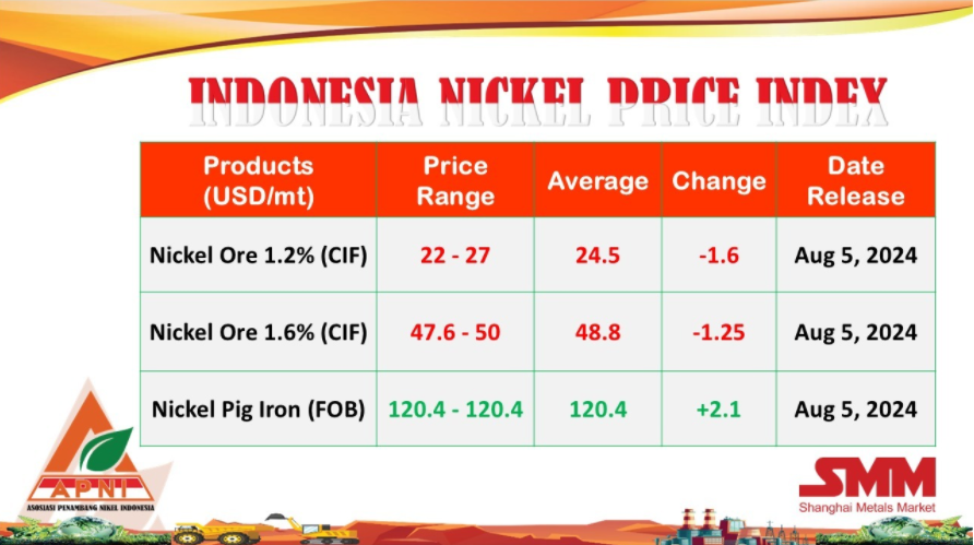 The Indonesian nickel miner association (APNI) has just released the Mineral price (HMA) of high nickel ore and of lower nickel ore for August 2024. |